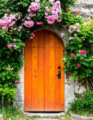 Wooden door nestled in stone archway, embraced by vibrant pink climbing roses