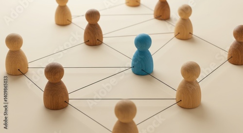 Wooden figures connected by lines one blue figure stands out from the others.