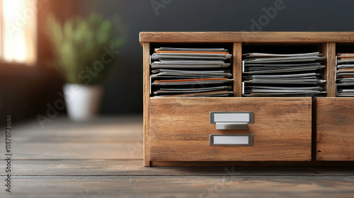 wooden filing cabinet with organized documents and plant in background creates warm and inviting workspace atmosphere