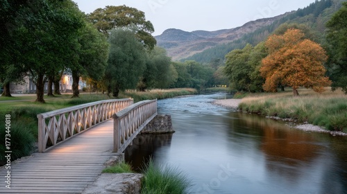 Wooden Footbridge Illuminated by Warm Lights Over a Shallow River in a Scenic Landscape With Mountains and Lush Green Trees During Twilight