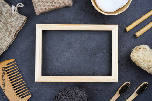 Wooden frame, various natural bath tools on gray concrete background. Spa, healthcare, zero waste concept. Top view, flay lay, copy space, mockup