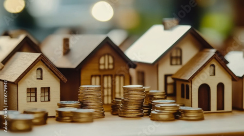 wooden house models placed on increasing stacks of coins