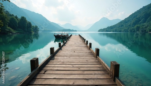 Wooden jetty extending into a serene fishing lake, pier, wooden, reflection