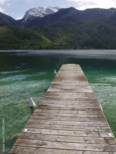 wooden jetty into annecy lake in duingt in front of Talloires, haute savoie, france. Idillyc lake and mountains landscape