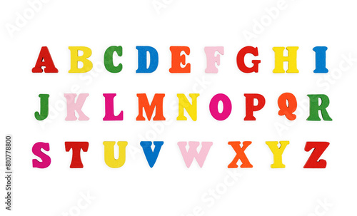 wooden letters of the English alphabet multi-colored on a isolated background close-up