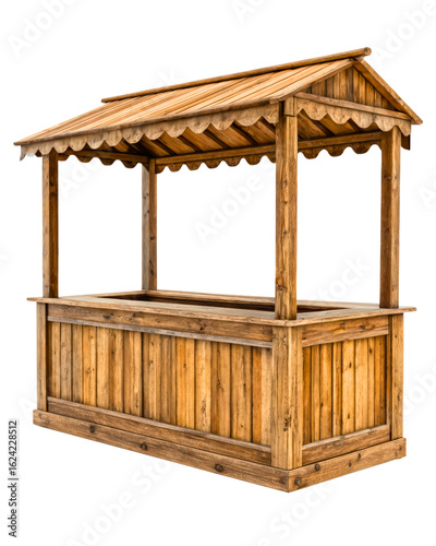 Wooden market stall with pitched roof and decorative trim on a transparent background