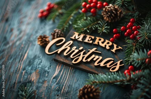Wooden Merry Christmas Sign Surrounded by Pine Branches and Red Berries