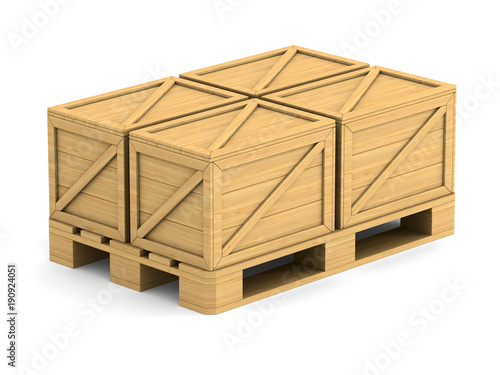 wooden pallet with cargo box on white background. Isolated 3D illustration