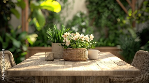 Wooden patio table with flowers and plants