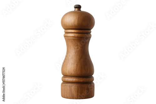 Wooden pepper grinder presenting traditional design, standing against clean background with rustic kitchen aesthetic