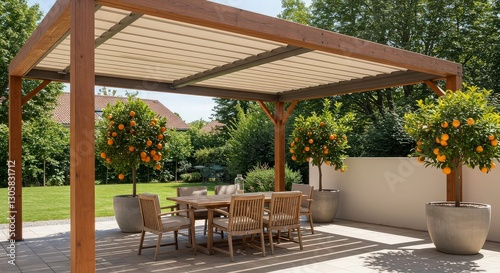 Wooden Pergola Outdoor Dining Area Sunny Day Patio Furniture Ultra HD 4K