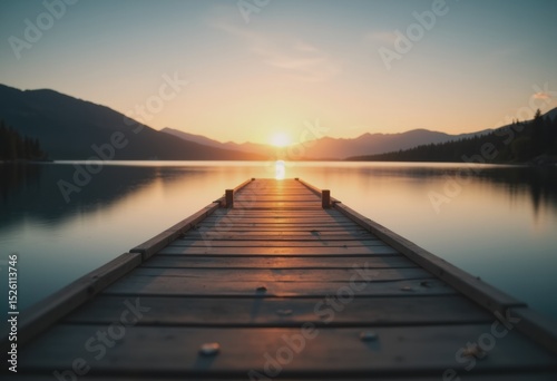 Wooden pier extending into a calm lake at sunrise, creating a serene atmosphere