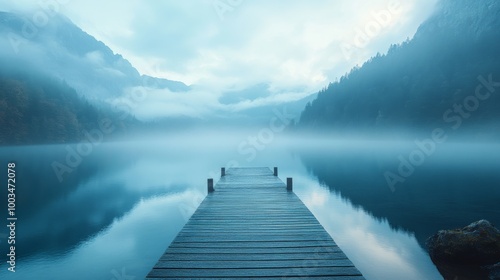 Wooden Pier Extending into Misty Lake with Mountain Landscape