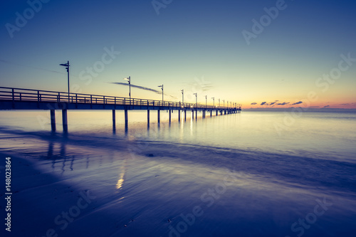 Wooden pier in Mechelinki. Small fishing village in Poland. Amazing Sunrise at the beach