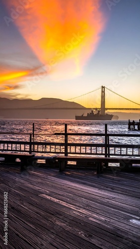 Wooden pier view of a sunset over a bay, featuring a bridge and a ship