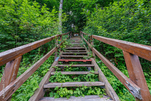 wooden plank footh path boardwalk in green foliage sourroundings