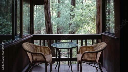 Wooden porch with wicker chairs and a small table overlooking a forest.