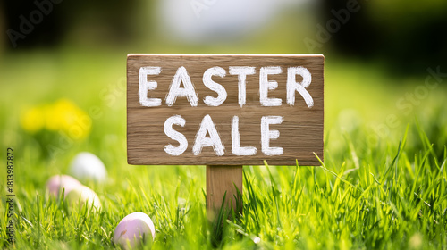Wooden sign with Easter Sale text standing in green grass with eggs