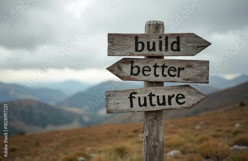 Wooden signpost shows directions to build better future against mountain landscape. Concept for eco sustainability projects. Symbol of positive change, strategy, progress, solutions for climate