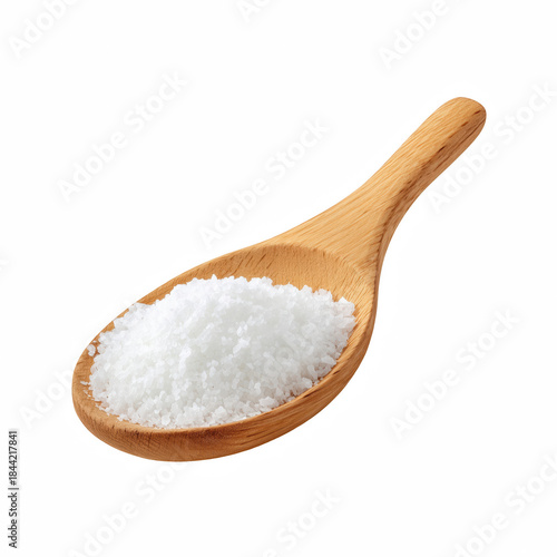 Wooden spoon filled with coarse sea salt crystals isolated on transparent background