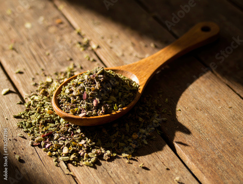 Wooden spoon filled with dried herbs and spices on rustic wooden surface