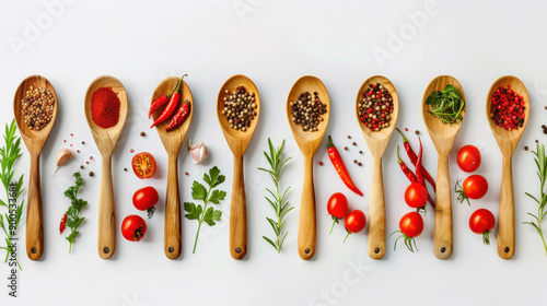 Wooden spoons filled with various spices and fresh herbs arranged on a white background, showcasing culinary ingredients for cooking.