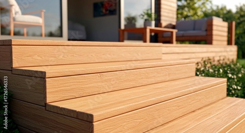 wooden staircase in the park, Wooden deck steps construction detail, featuring planks and support beams. Patio area with blurred interior background. Natural wood grain, building material for home imp