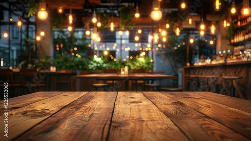 Wooden table against blurred backdrop of chic restaurant at night, ideal for conveying lively, modern dining ambiance