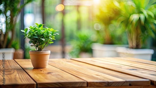 Wooden table with plant, blurred background.