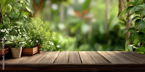 Wooden Table With Potted Plants Against Blurred Greenery, Representing Natural Wellness and Sustainable Living for Product Placement and Mockups : Generative AI