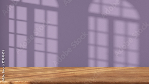 Wooden table with purple stucco wall background with window light beam and shadow. Product presentation mock up. Empty interior design concept