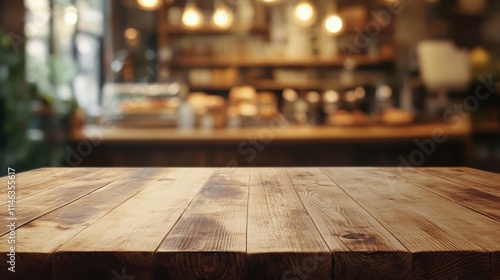 Wooden tabletop in a cozy cafe with blurred background showcasing baked goods and warm lighting