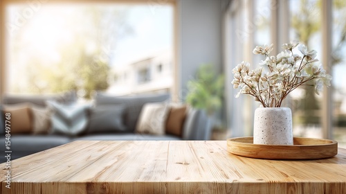 Wooden Tabletop Scene with White Flowers in Vase Modern Home Decor Stylish Interior Design Bright Sunny Room Natural Light Elegant Spring Blossom Arrangement Cozy Living Room