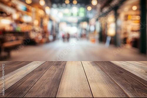 Wooden tabletop with blurred background of a modern interior with lights.