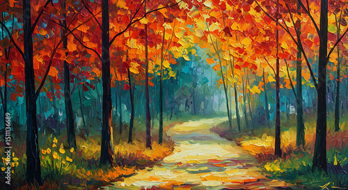 Woodland Trail Art with Textured Brushwork and Seasonal Foliage