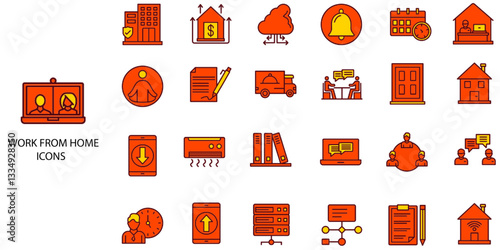 Work from home simple concept 24 color icons set. Contains such Laptops with Idea Sharing, Representing Teamwork, Problem Solving, and Remote Working .Vector illustration.