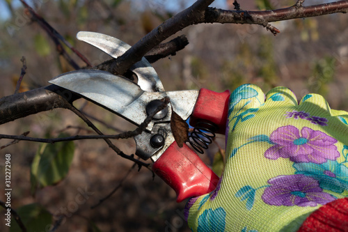 Work in the garden. Close-up. A hand in a garden glove with a garden pruner cuts a tree branch.