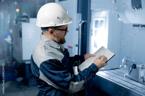 Worker caucasian engineer professional man control CNC machinery on industry factory
