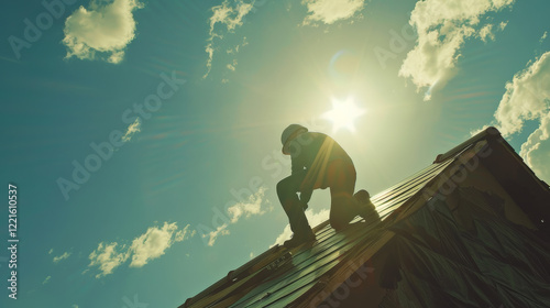 worker climbs roof under bright sun and blue sky, showcasing determination