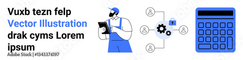 Worker holding clipboard, connected user nodes with gears and padlock, and digital calculator. Ideal for collaboration, teamwork, tech, calculation, logistics, business management simple landing