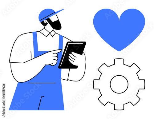 Worker in uniform holding and pointing at tablet, blue heart and gear nearby. Ideal for technology, industry, customer support, maintenance, innovation, teamwork, simple landing page