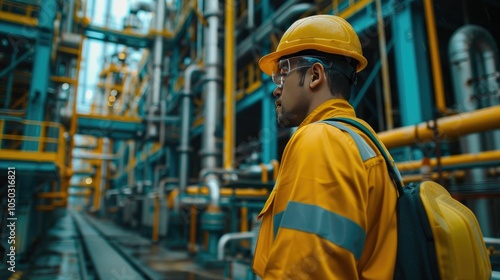 Worker in yellow uniform and helmet at industrial site, machinery in background.