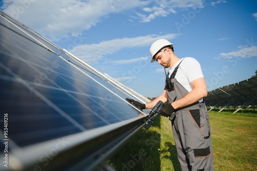 Worker installing solar panels outdoors