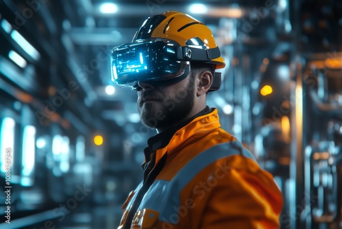 worker man in uniform and helmet is wearing vr glasses in industrial plant