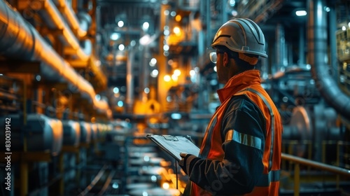 Worker Monitoring Pipeline Infrastructure. Maintaining Energy Supply and Sustainability. Technician Inspecting Advanced Industrial Equipment