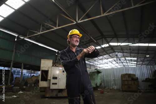 worker or engineer working in factory with safety uniform , safety hat and safety glasses , image is safety concept or happy workplace