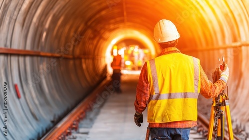 Worker surveying a tunnel construction site.