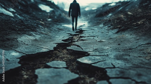 Worker walking on cracked path, each step shattering the ground, symbolizing burnout