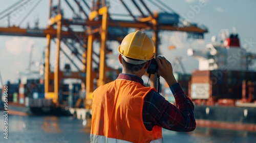 Worker with Radio on Cargo Ship Dock