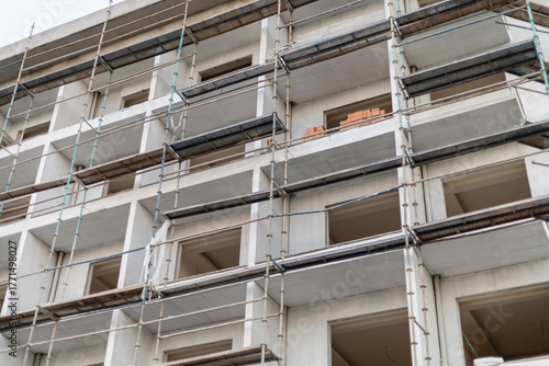 Workers are using scaffolding to access different levels of a multi-story building under construction. The image shows exposed walls and construction materials nearby